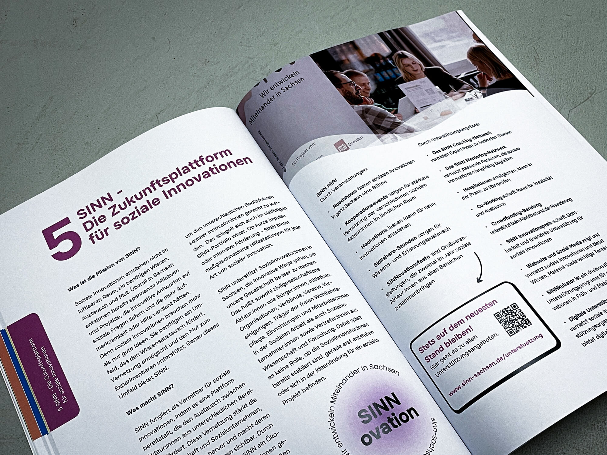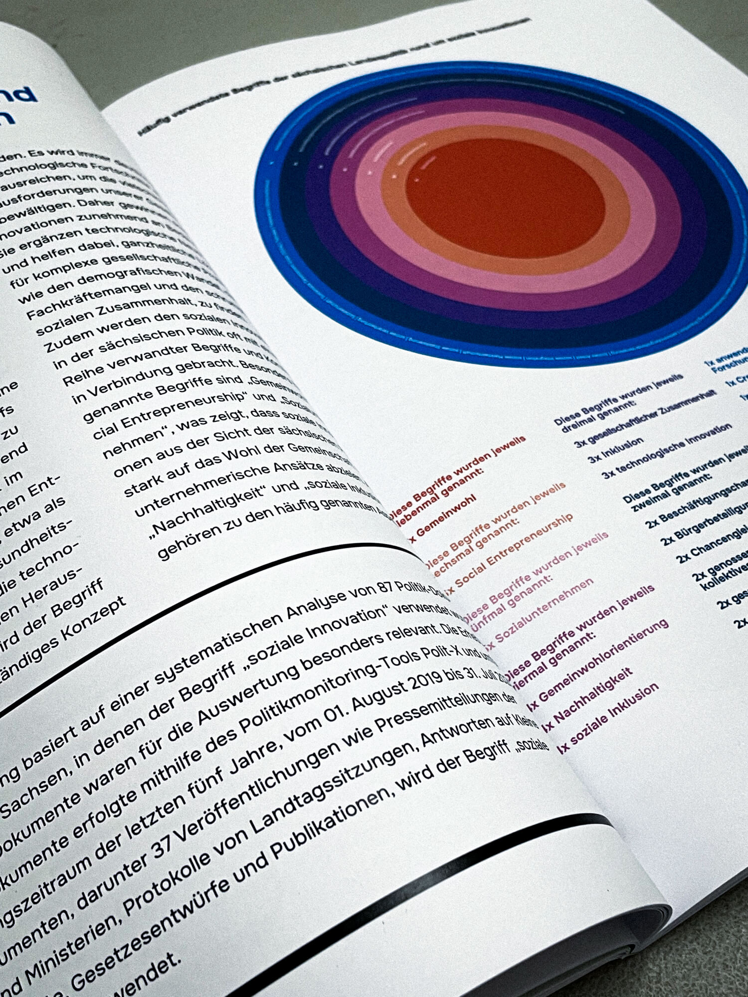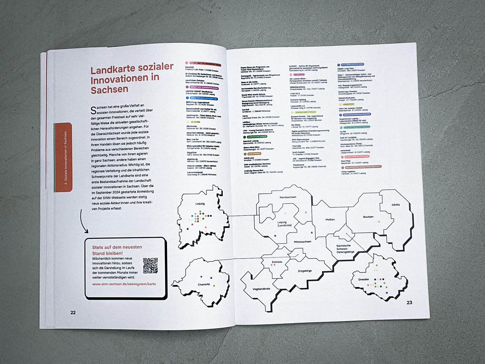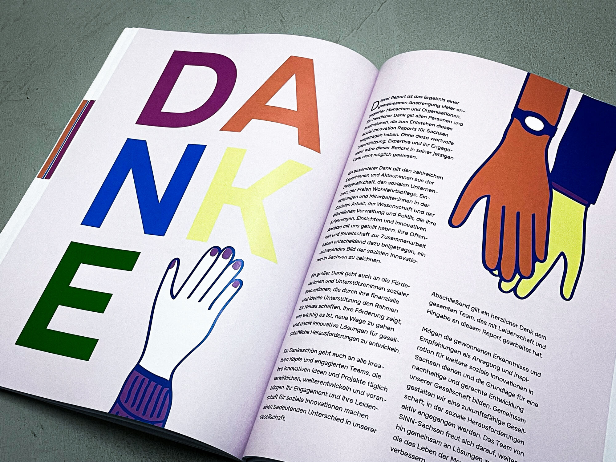 Der „Social Innovation Report“ in Zusammenarbeit mit SINN Sachsen ist mehr als nur ein Bericht – er ist ein lebendiges, farbenfrohes Dokument, das die sozialen Veränderungen und Innovationen in Sachsen auf anschauliche Weise darstellt. Durch die Integration von klar strukturierten Infografiken wird der komplexe Inhalt für Lesende greifbar und leicht verständlich. Die visuelle Gestaltung hebt die Kernthemen des Berichts hervor und sorgt dafür, dass Zahlen, Fakten und Ideen auf eine kreative, fesselnde Art präsentiert werden. Ziel war es, die Vielfalt und den Reichtum an sozialen Innovationen in Sachsen visuell aufzuzeigen, Inspirationen zu bieten und einen Dialog anzustoßen. Ein Report, der nicht nur informiert, sondern inspiriert.